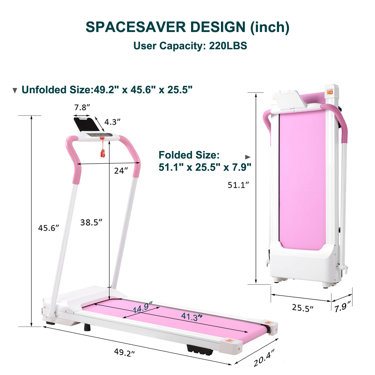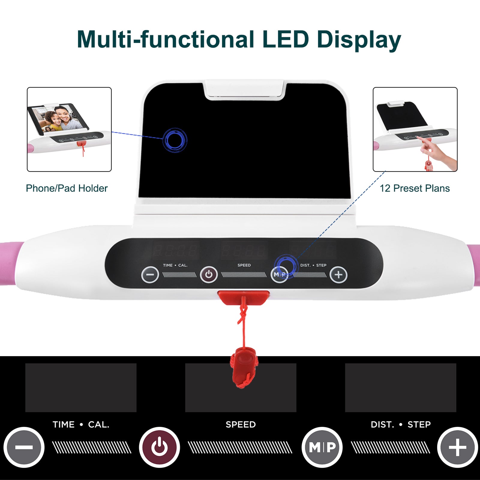 - 【Multi-functional LED Display】It tracks your performance in time, speed, distance and step, promising a superior and effective home treadmill workout. You could put your mobile phone or pad on the holder and talk with your friends or watch movies when you work out on this compact treadmill.