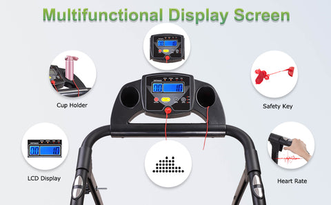 - 【Multifunctional Display Screen】Multi-functional LCD display can track your time, speed, distance, heart rate and calories burnt, which helps you work out more efficiently and scientifically. Our electric treadmills can withstand 220 pounds of weight due to its heavy-duty construction.