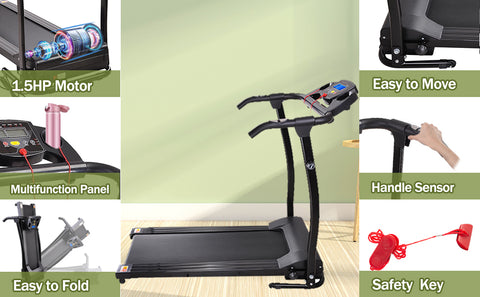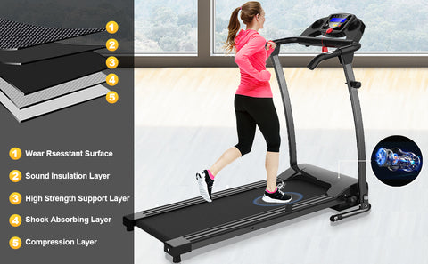 - 【Quiet & Smooth】This running machine with low motor is designed for a home environment. The 1.5HP motor ensures perfect performance for running, jogging or walking in the comfort of your home. 5 layer shock-absorbing running belt providing an effective and safe cushion for your knees and muscles when running.