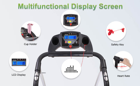 - 【Multifunctional Display Screen】Multi-functional LCD display can track your time, speed, distance, heart rate and calories burnt, which helps you work out more efficiently and scientifically. Our electric treadmills can withstand 220 pounds of weight due to its heavy-duty construction.