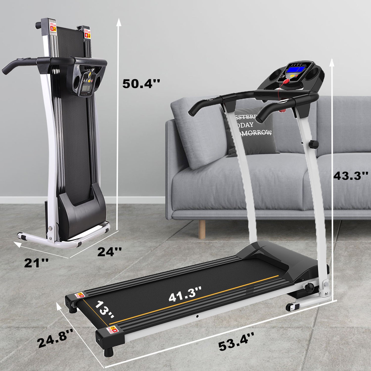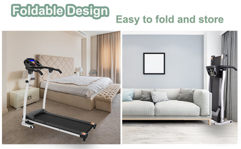 - 【Foldable Design & Transportation Wheels】This portable treadmill boasts a compact footprint and fast folding design with convenient transportation wheels to move around without hassle. You can either store it in your living room, study, any small corner of home. Please contact us first if you have any installation and using questions.
