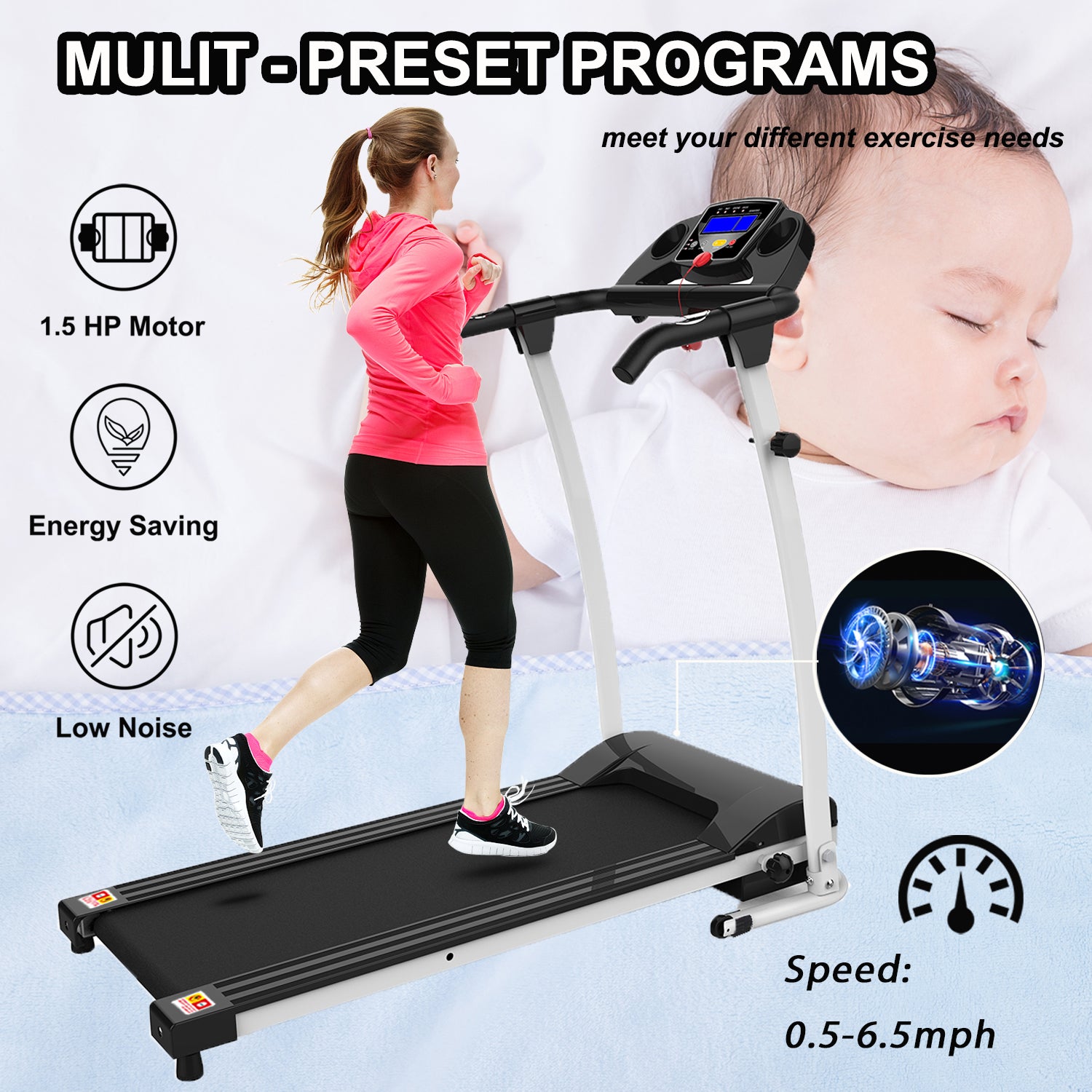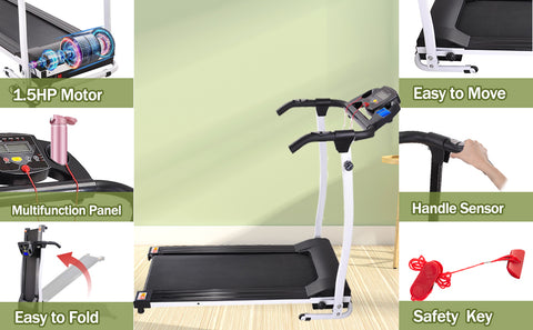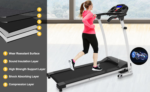 - 【Quiet & Smooth】This running machine with low motor is designed for a home environment. The 1.5HP motor ensures perfect performance for running, jogging or walking in the comfort of your home. 5 layer shock-absorbing running belt providing an effective and safe cushion for your knees and muscles when running.