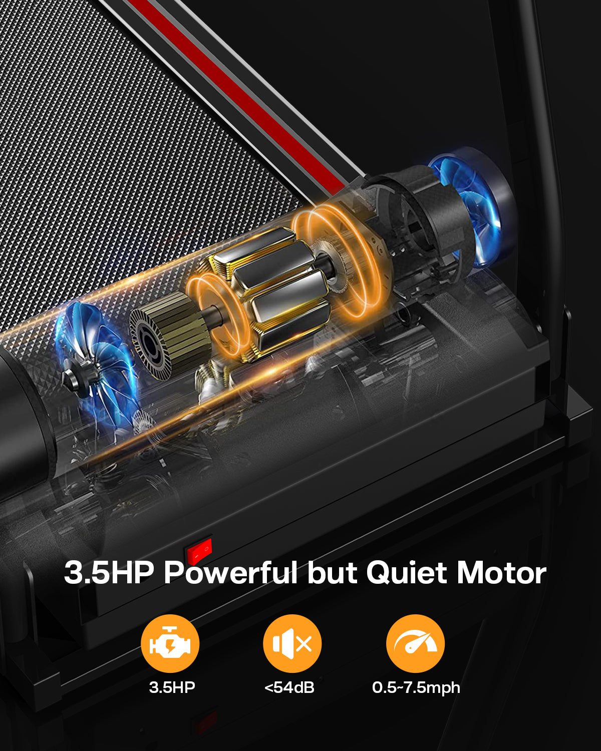 【3.5 HP Quiet Motor & Spacious Running Belt】This electric treadmill with a 3.5 HP powerful quiet Motor. The large running belt features 47"L x16" W, The Wider belt gives your feet a comfortable area and no worry of drifting off the side of the machine when doing exercising.